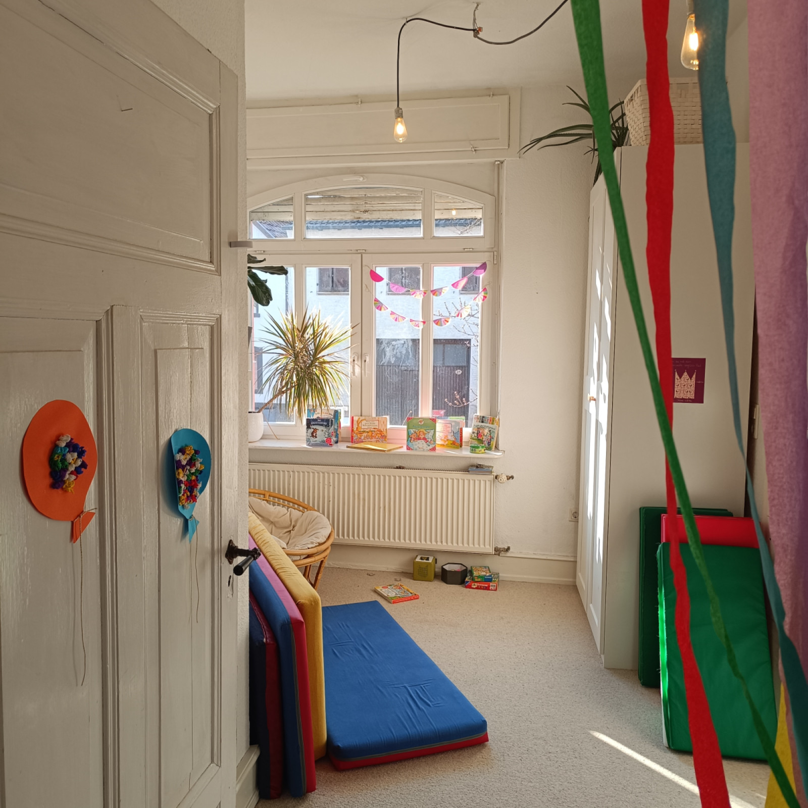 Vom Flur abgehend befindet sich der Ruheraum. Dieser Raum ist jedoch so aufgebaut, dass er nicht nur zum Schlafen und Ruhen dient, sondern auch zum Purzelbäume schlagen und Herumtollen. Der Wechsel vom Bewegungsraum zum Ruheraum wird den Kindern deutlich, wenn zur Ruhezeit die Betten aufgebaut und die Schaummatten weggeräumt werden. Alle Räumlichkeiten und auch unsere Toilette befinden sich im Erdgeschoss. Das obere Stockwerk wird nicht mitgenutzt.