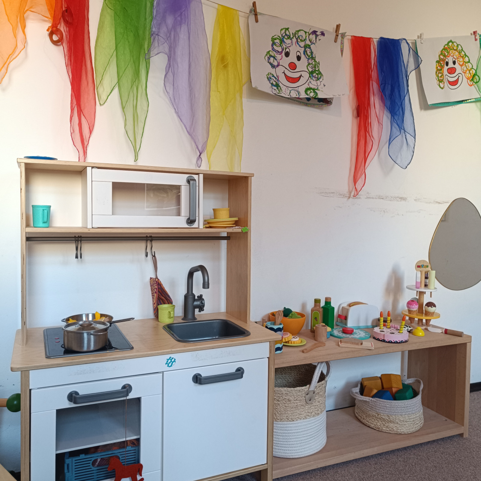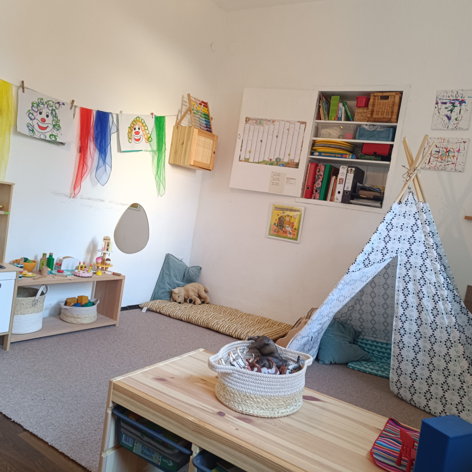Die Räume meiner Kindertagespflege bieten den Kindern viel Platz zum Toben, Spielen und Schlafen. Unser Aufenthaltsraum umfasst 15 m2 und befindet sich im Erdgeschoss. Er hat zwei Fenster zum Garten hinaus, die den Raum hell und freundlich erscheinen lassen. Der Aufenthaltsraum besitzt einen kleinen Tisch, an dem wir am Morgen zum Frühstück zusammenkommen.